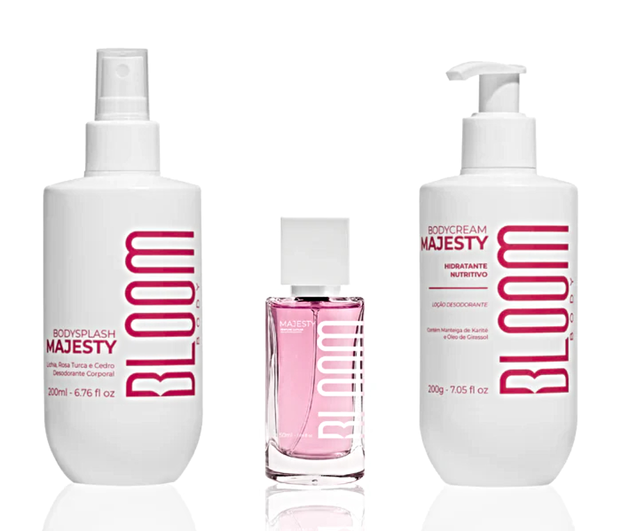 Kit Bloom Majesty Body Splash 200ml+ Body Cream Hidratante Corporal 200g+ Perfume Capilar 50ml
