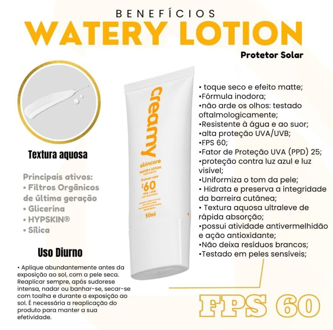 O Creamy Watery Lotion é um filtro solar aquoso de toque seco e rápida absorção, ideal para todos os tipos de pele, especialmente as oleosas. Oferece alta proteção (FPS 60) com Fator de Proteção UVA (PPD) 25, proteção contra a luz azul e a luz visível, efeito matte e controle de oleosidade e brilho excessivo, além de promover a uniformização da pele.