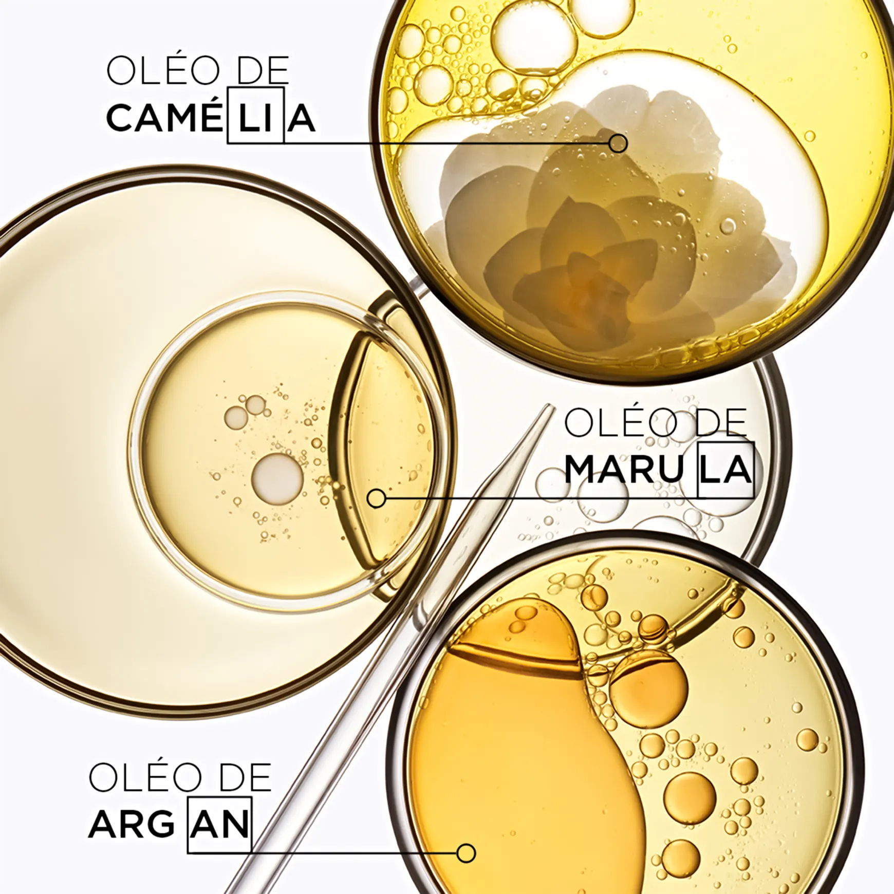 Óleo de Camélia: suaviza a fibra capilar para proporcionar um brilho incrível. Óleo de Germe do Milho: ingrediente ativo com importante função nutricional e de proteção. Óleo de Pracaxi: promove brilho, nutrição e condicionamento profundo aos cabelos. Óleo de Argan: auxilia no fortalecimento do cabelo e a protege-lo de agressores externos.