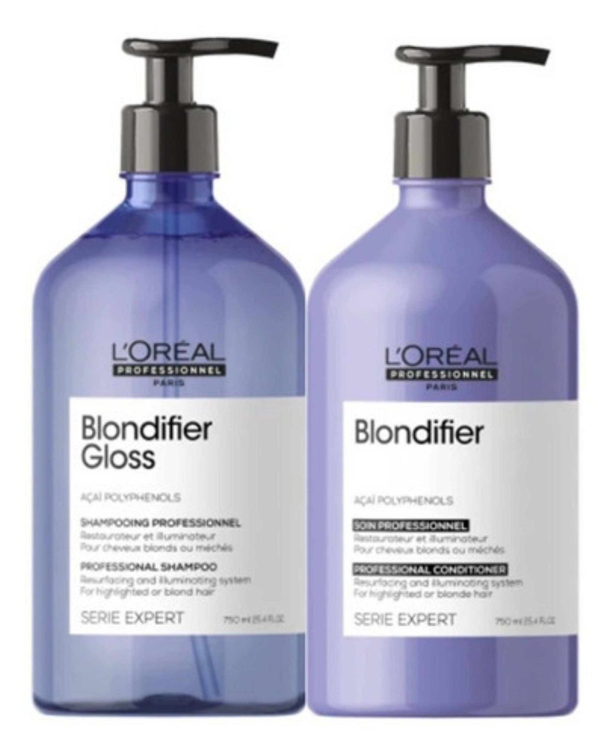 Kit LOréal Professionnel Blondifier Gloss - Shampoo 750ml + Condicionador 750ml: Kit com shampoo e condicionador para loiros, descoloridos e com mechas. Higieniza e reacende a luminosidade com uma rotina que não agride a estrutura da fibra capilar. São itens básicos para compor o dia a dia de cuidados para quem tem cabelo descolorido ou loiro e quer manter o tom vibrante e brilhante por muito mais tempo. Componentes: Açai Polyphenols: os polifenóis do açaí são importantes antioxidantes que previnem o desgaste (oxidação) dos cabelos claros ou descoloridos, sensíveis às exposições climáticas, poluição e outros fatores. Presente nas duas linhas Blondifier Cool e Gloss.
