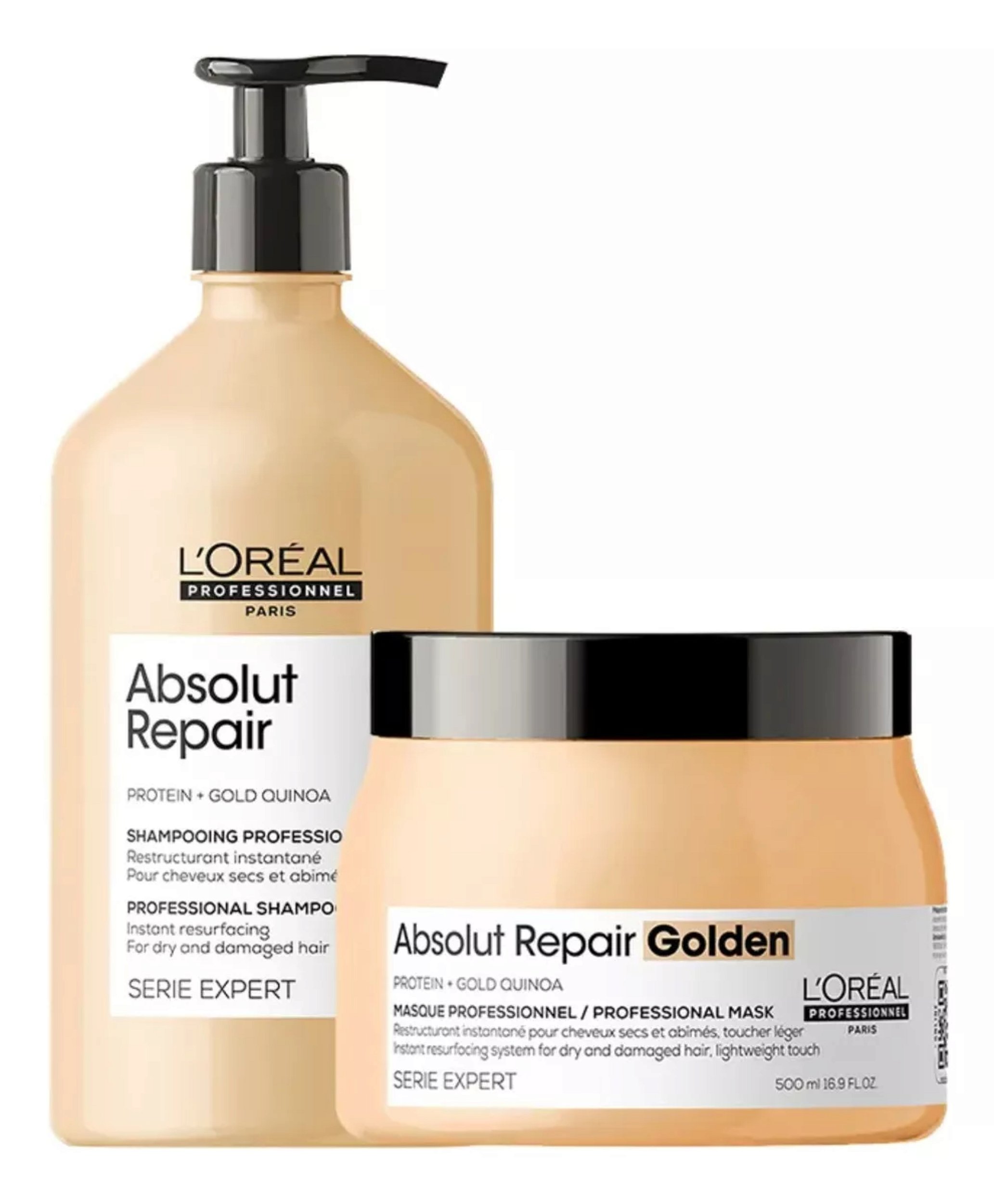 Kit com shampoo e máscara de tratamento para cabelos danificados. LOréal Professionnel Serie Expert Absolut Repair Gold Quinoa + Protein Golden Lightweight ajuda a restaurar os fios sem pesar, além de promover brilho intenso.
