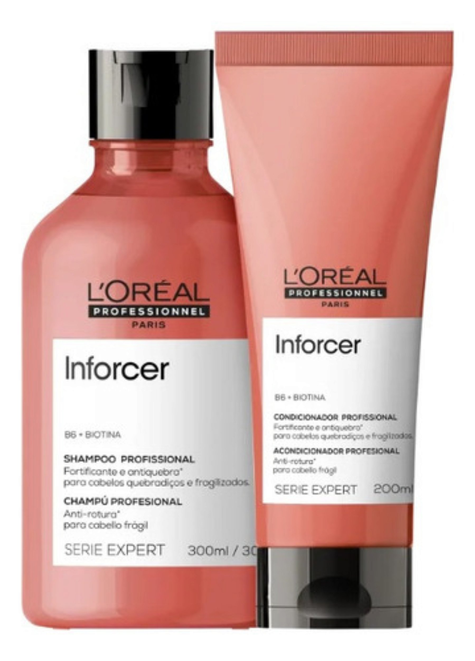 Kit LOréal Profissional Inforcer Shampoo 300mls + Condicionador 200mls 1 LOréal Shampoo Inforcer 300mls 1 LOréal Condicionador Inforcer 200mls Kit para cabelos debilitados, quebradiços. Fortalece e Repara a fibra capilar