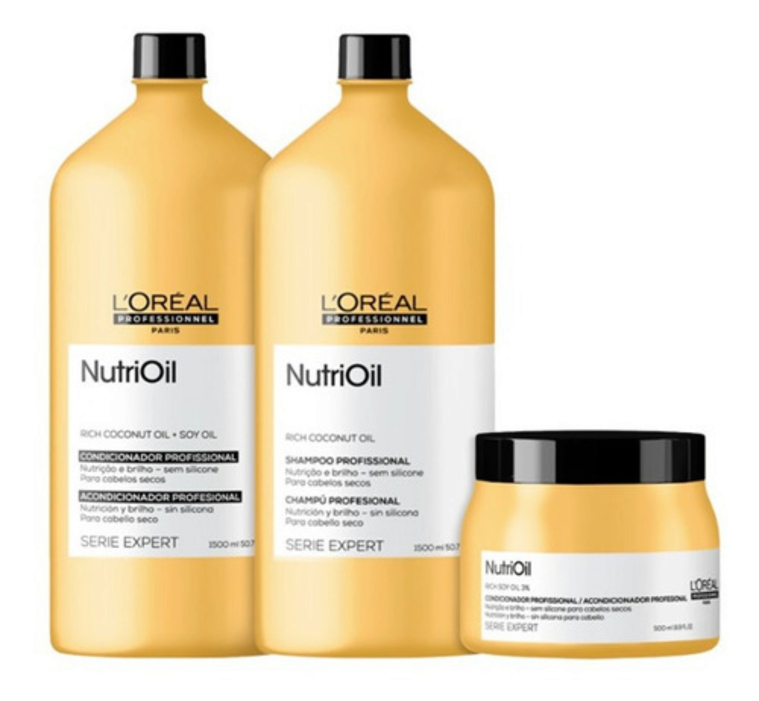 Kit Loréal Professionnel Nutrioil Shampoo 1,5 Litro + Condicionador 1,5 Litro + Máscara 500g Kit para cabelos ressecados, nutre e recupera a beleza dos fios com uma rotina de cuidados essenciais. São produtos para limpeza e condicionamento da fibra capilar, com fórmulas que recuperam intensamente a estrutura e devolvem o brilho e a maciez com os nutrientes necessários para sua saúde. Componentes: ÓLEO DE COCO: tem ação umectante, que adere ao fio formando uma camada protetora na superfície. Além de penetrar na fibra, fortalecendo a sua resistência e promovendo nutrição com maciez, brilho e movimento. ÓLEO DE SOJA: é um ingrediente que promove força e proteção capilar, trazendo de volta a vida cabelos fracos e quebradiços. Seu uso contínuo reduz a porosidade dos fios tornando o cabelo mais forte e mais fácil de desembaraçar.