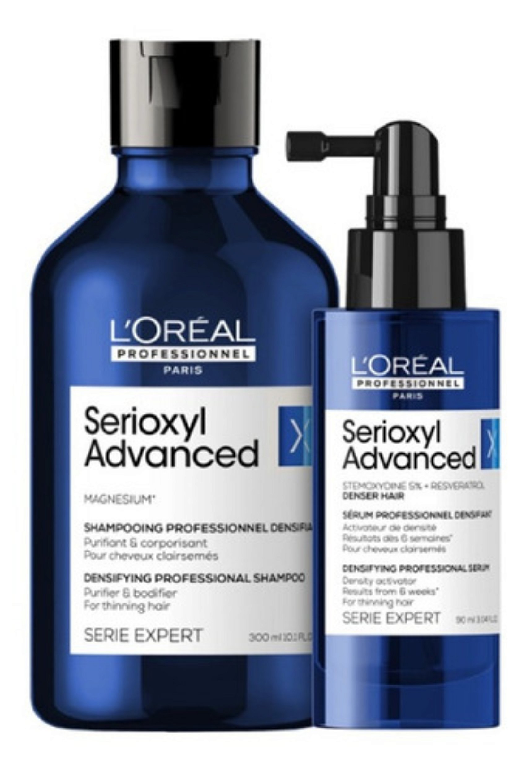 Kit Loréal Serioxyl Advanced Shampoo 300ml+ Sérum Denser Hair 90ml Kit com shampoo e sérum para cabelos com afinamento, fios mais encorpados e volumosos em 6 semanas. Purifica, oferece mais densidade e reduz a queda, garantindo um cabelo mais saudável. - Componentes: *Sal de Magnésio: ajuda a purificar raízes capilares do acúmulo que pode impactar o crescimento saudável do cabelo. Contém: -LOréal Professionnel Serie Expert Serioxyl Advanced - Shampoo 300ml: purifica suavemente e dá sensação de densidade renovada. -LOréal Professionnel Serie Expert Serioxyl Advanced - Sérum 90ml: multiplica o número de fios com uso diário, para um cabelo mais denso.