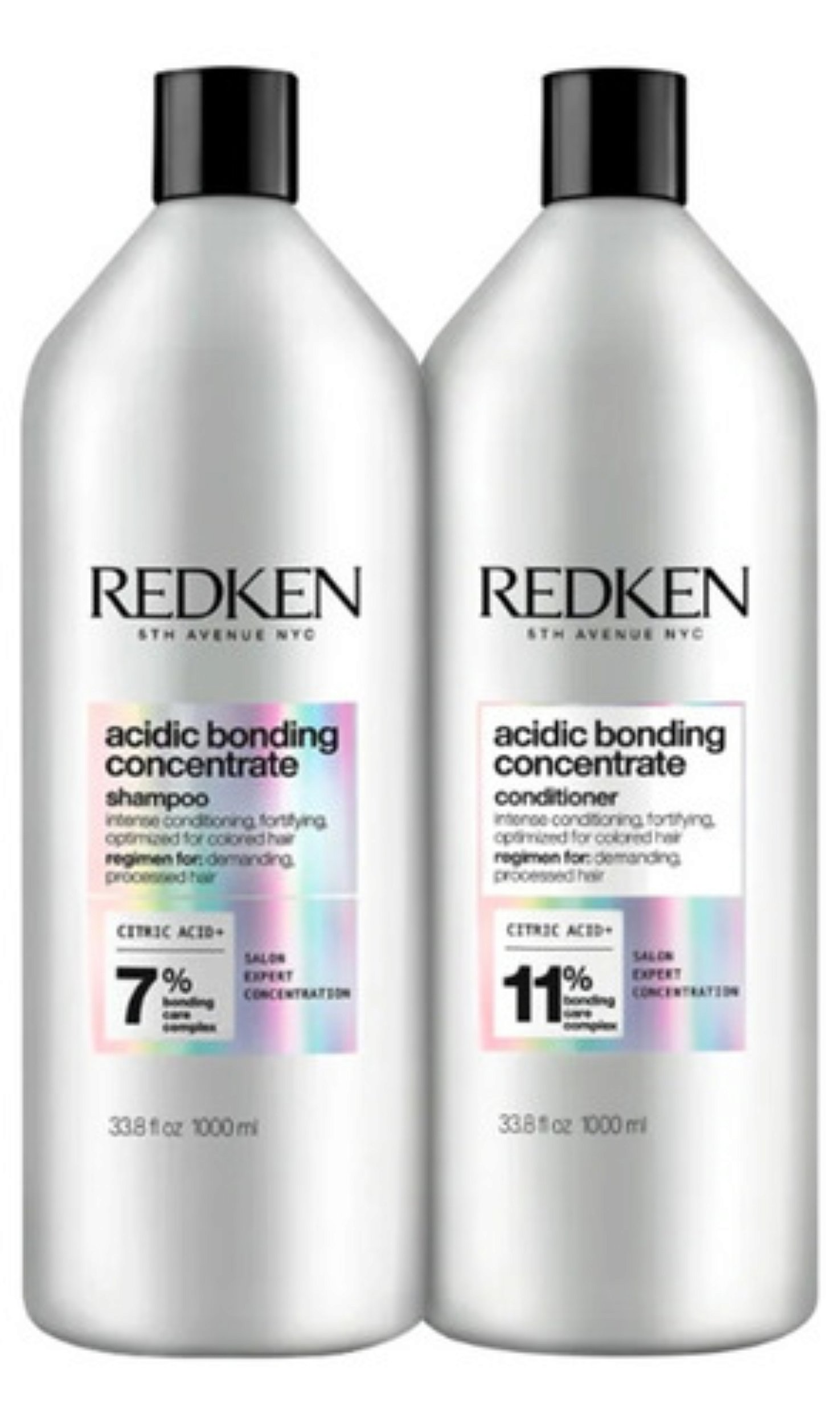 Kit Redken Acidic Bonding Shampoo 1000ml + Condicionador 1000ml Redken Acidic Bonding Concentrate Duo Padrão remove as impurezas, enquanto hidrata o comprimento. Foi desenvolvido para cabelos secos e danificados. Sua inserção na rotina de haircare traz mais força para o bulbo, fortalecendo a resistência do comprimento e equilibrando o pH, para um cabelo mais forte e saudável. -Componentes: Ácido Cítrico + Redken Bonding Care Complex: promovem resultados instantaneamente visíveis, que resulta em 82% menos pontas duplas, 56% menos quebra e 11x mais maciez. -Contém: Redken Acidic Bonding Concentrate - Shampoo 1000ml: proporciona máxima reparação e proteção da fibra capilar. Redken Acidic Bonding Concentrate - Condicionador 1000ml: oferece o máximo em reparação e condicionamento intenso.