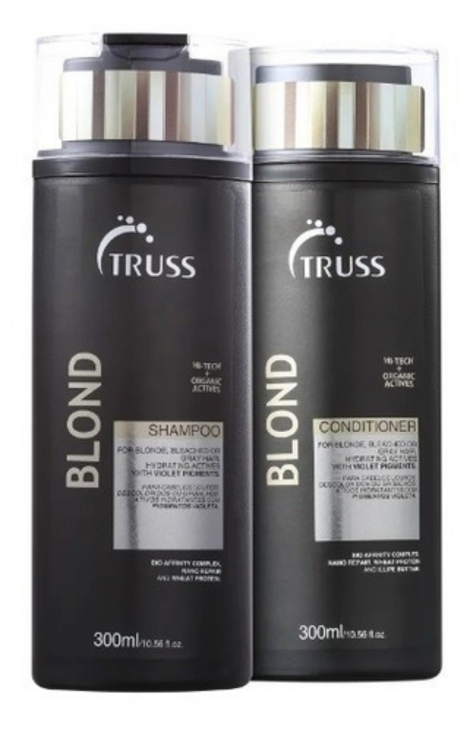 Kit Truss Blond Shampoo 300mls + Condicionador 300mls Kit de tratamento diário para cabelos loiros, descoloridos ou com luzes, combate o tom amarelado e fortalece os fios. Os pigmentos violetas neutralizam tons amarelados dos fios causados pela oxidação, aumenta elasticidade e sela as cutículas, o que confere maior resistência contra a quebra, além de luminosidade e maciez. Componentes: *Bio Affinity Complex: elaborado com fitonutrientes que reparam a cutícula fragilizada por processos químicos ou agressões externas. *Blend de Pigmentos Violeta: atuam na neutralização dos tons amarelados e alaranjados em cabelos loiros, descoloridos e grisalhos. *Tahiti Monoi Oil: óleo vegetal 100% natural que restaura, hidrata e protege da ação dos radicais livres. *Manteiga de Illipe: fruto exótico rico em ácidos graxos, ajuda a preservar a estrutura dos lipídeos para manter a hidratação.