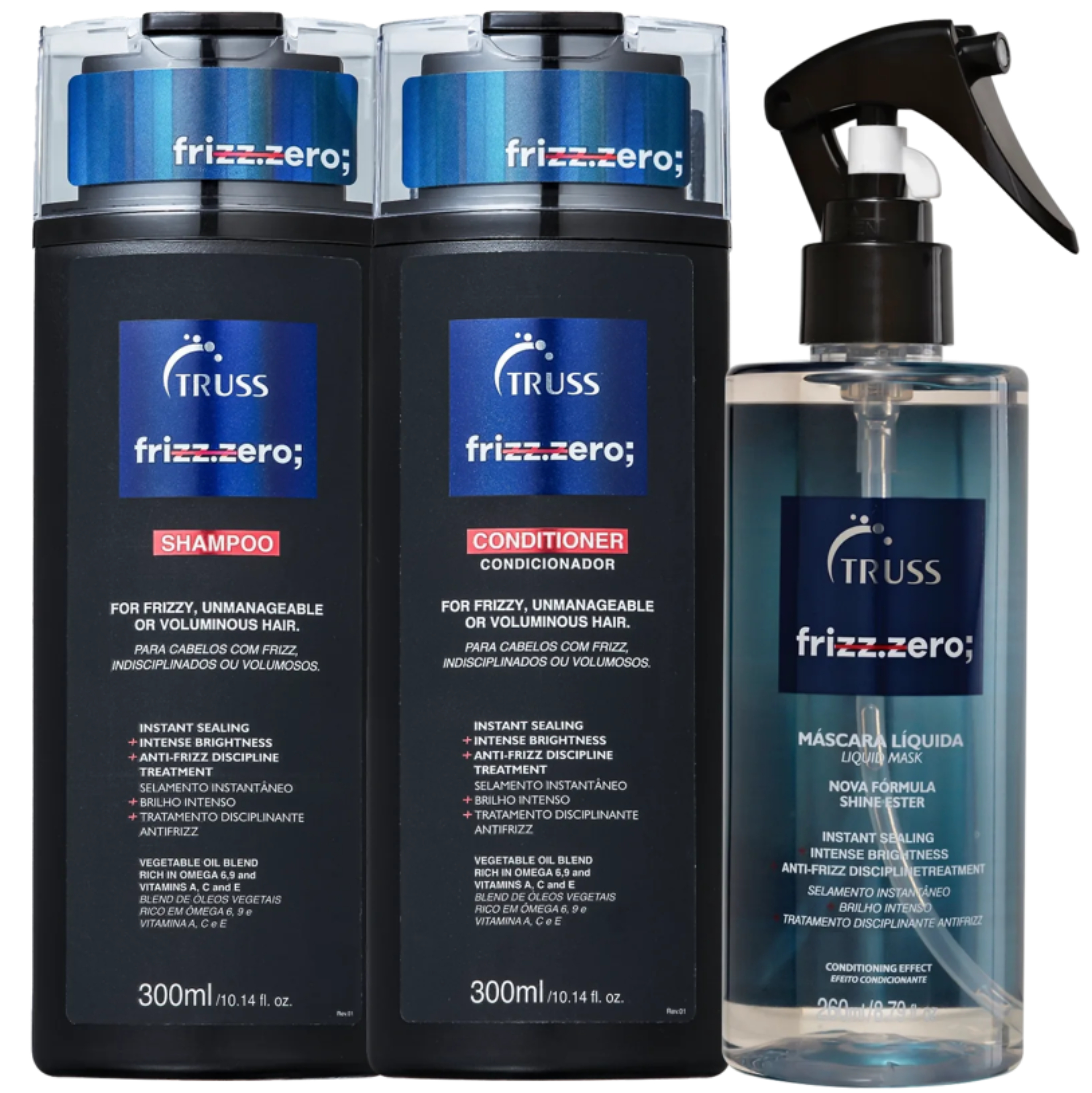 Kit Truss Frizz Zero Shampoo 300ml+ Condicionador 300ml+ Leave-in 260ml Cuidados diários necessários para cabelos com frizz, indisciplinados ou volumosos. Limpa suavemente sem agredir os fios, além de proporcionar maleabilidade e condicionamento, garantindo cabelos mais brilhantes, com toque sedoso e efeito antifrizz.