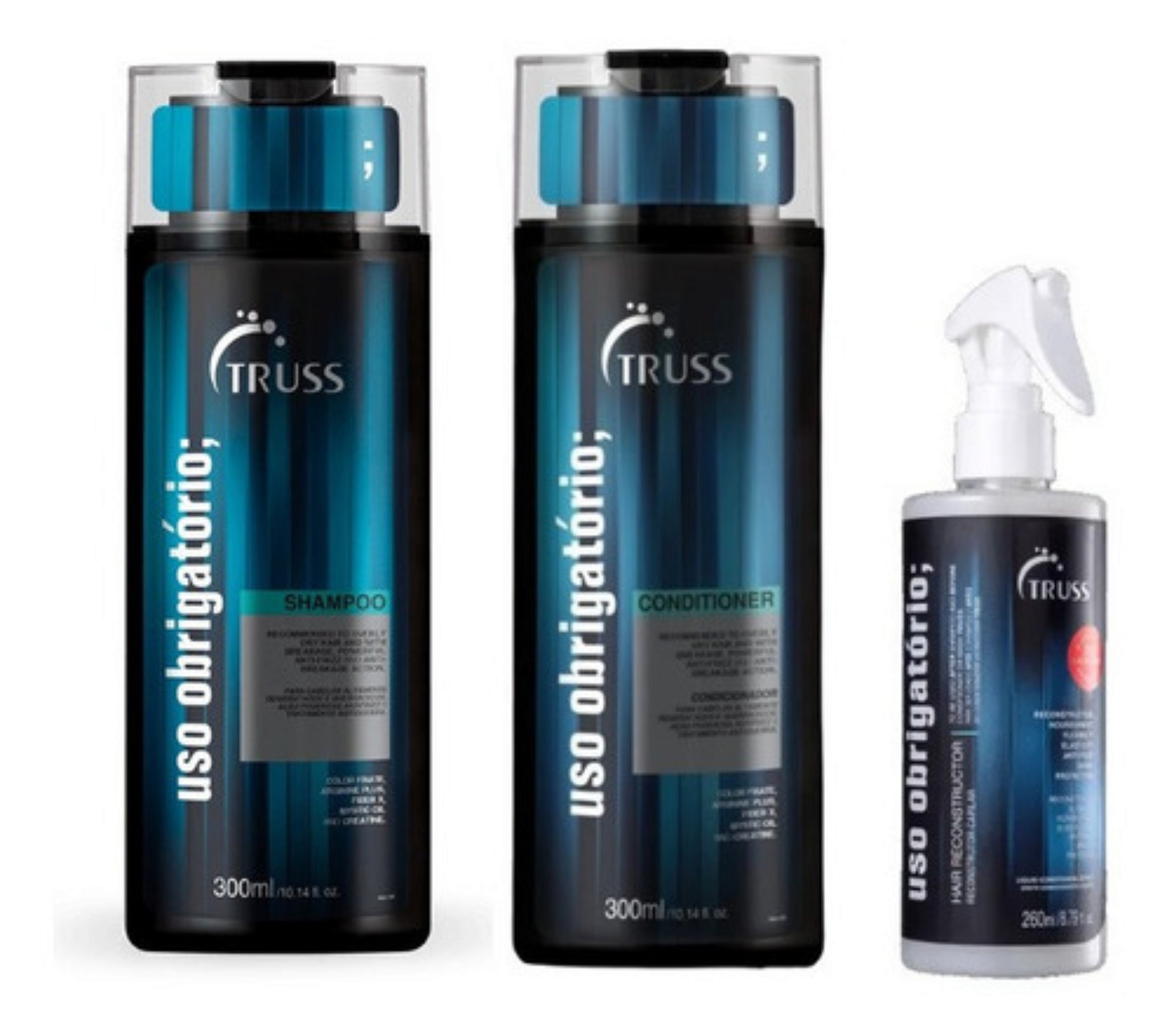 Kit Truss Uso Obrigatório Shampoo 300ml+ Condicionador 300ml+ Leavein 260ml Kit de tratamento reconstrutor limpa suavemente, reduzindo os danos em cabelo com química, hidrata e sela as cutículas. Confere suavidade e brilho aos fios e possui ação antidesbotamento. Brilho, redução do frizz, selamento das cutículas, color protection e controle da oleosidade. Indicado para todos os tipos de cabelo.