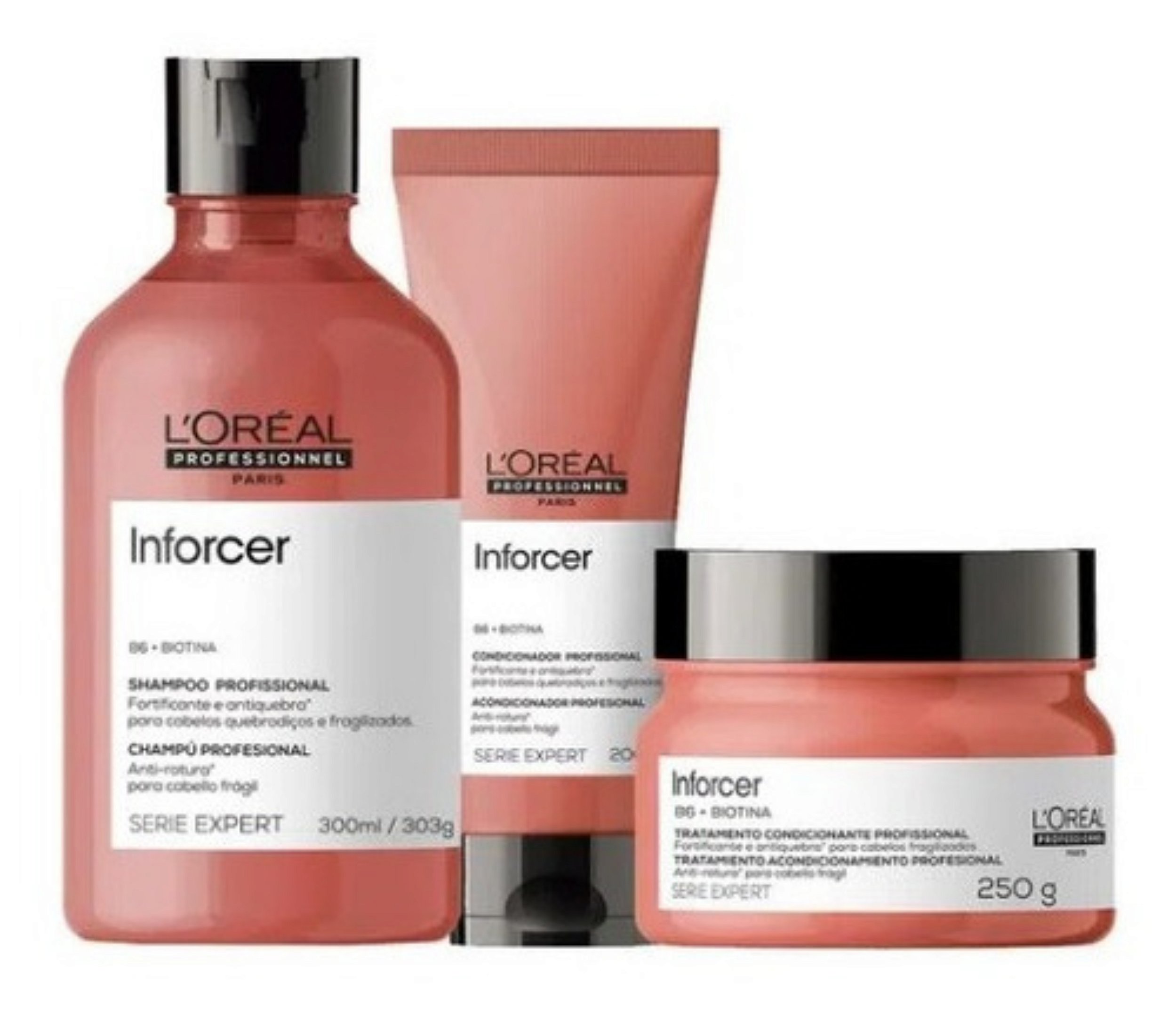 Kit LOréal Profissional Inforcer Shampoo 300mls+ Condicionador 200mls + Máscara 250grs 1 LOréal Shampoo Inforcer 300mls 1 LOréal Condicionador Inforcer 200mls 1 LOréal Máscara Inforcer 250grs Kit para cabelos debilitados, quebradiços. Repara a fibra capilar