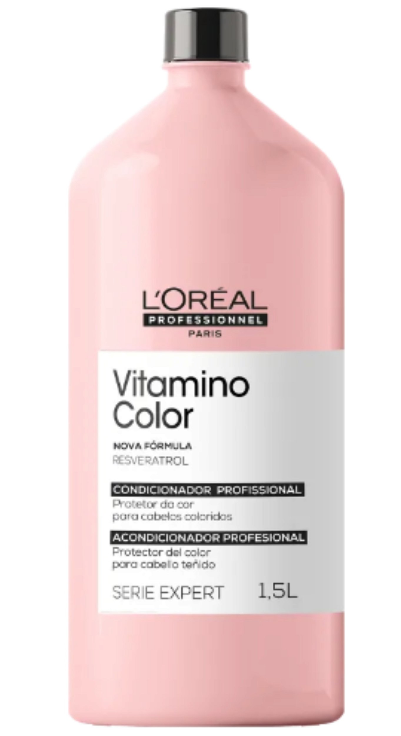 LOréal Professionnel Condicionador Vitamino Color 1500mls: Condicionador para cabelos coloridos. Sela cutículas e nutre para garantir que a cor permaneça vibrante por mais tempo. O Condicionador conta com o poderoso ativo antioxidante que protege os fios contra a oxidação e desbotamento. Além disso, garante fios macios e brilhantes, com a cor protegida dentro da fibra. Componentes: Resveratrol: é um polifenol altamente antioxidante extraído da casca da uva. Protege o cabelo contra os radicais livres, agentes oxidantes, e os raios UV, responsáveis pela degradação da cor. Pantenol: promove hidratação intensa para o cabelo. Adiciona mais brilho, maciez e aspecto saudável.