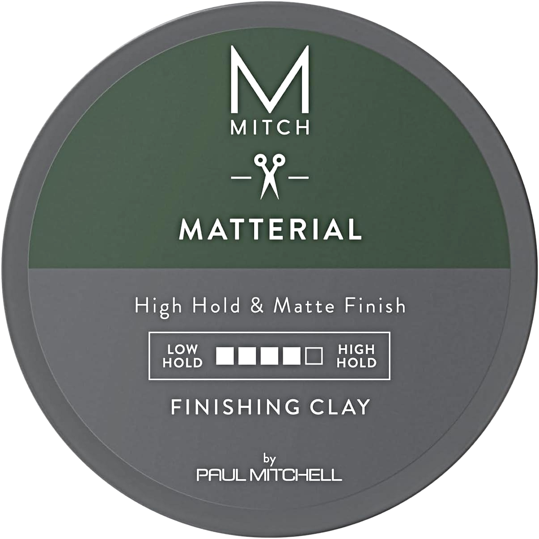 Pomada modeladora de fixação forte e acabamento ultra matte para cabelos masculinos. Paul Mitchell Mitch Matterial Styling Clay mantém o penteado no lugar por bastante tempo. Ela deixa um toque seco nos fios.