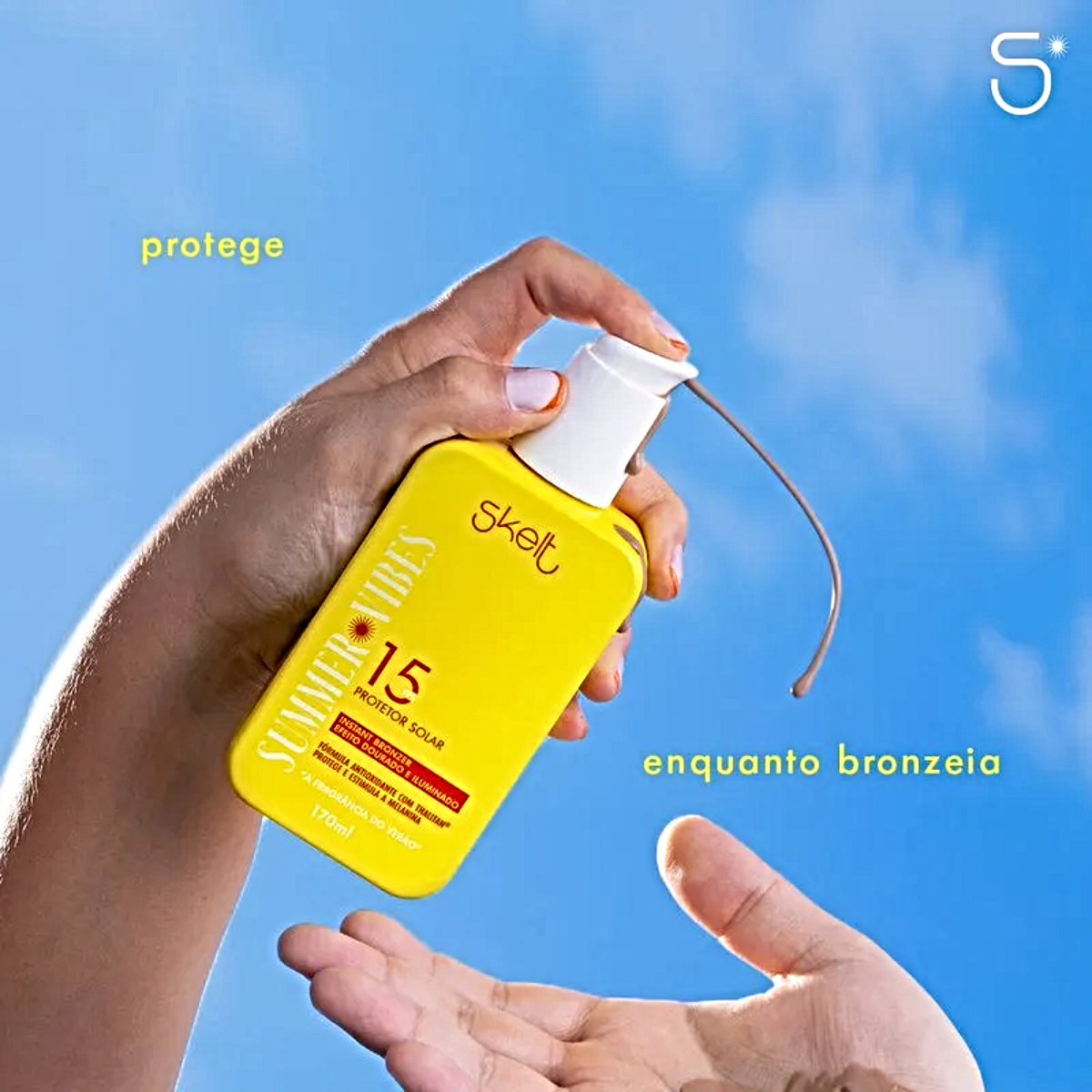 O Protetor Solar Summer Vibes está disponível em três opções de FPS: 8, 15 e 30. Ele é o equilíbrio perfeito entre cuidado, proteção e um bronzeado dourado e saudável. Possui toque seco e é resistente à água.